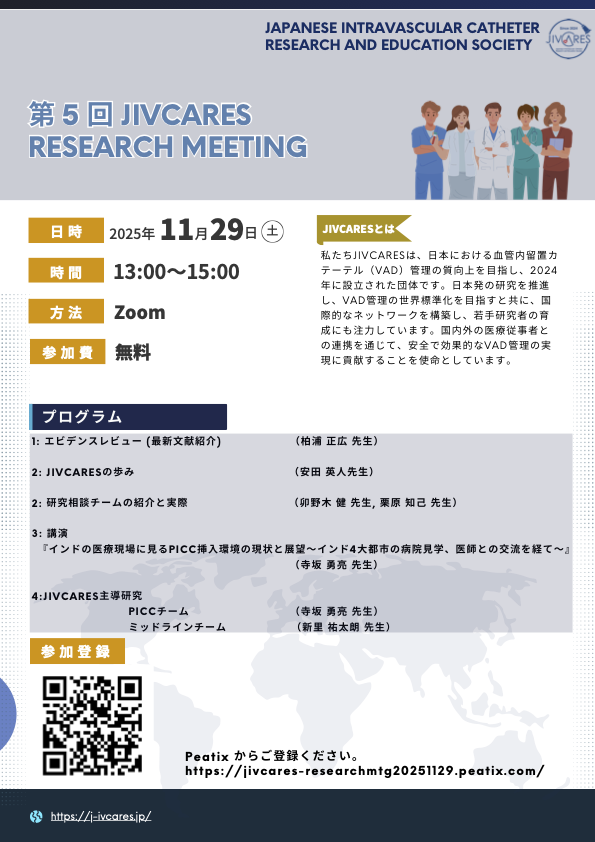 The Japan Intravascular Catheterization and Revascularization Research Society (JIVCARES) was established to improve the quality and global standardization of intravascular indwelling catheter (VAD) management in Japan. The purpose of this organization is to contribute to the development of VAD management in Japan by conducting a wide range of research on all aspects of VADs, generating evidence from Japan, training young researchers, conducting multi-center studies, and participating in international research.