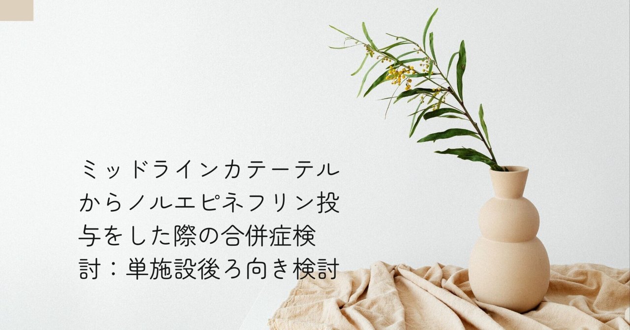 Although this is a report from a Swedish Intermediate medical care unit :IMCU, a unit that is not common in Japan, temporary peripheral intravenous administration of norepinephrine (NE) in emergency situations has also been proposed by the World Guidelines for Sepsis Care (SSCG). On the other hand, there are very few data on whether administration through a midline catheter (MC) in such cases decreases complications.